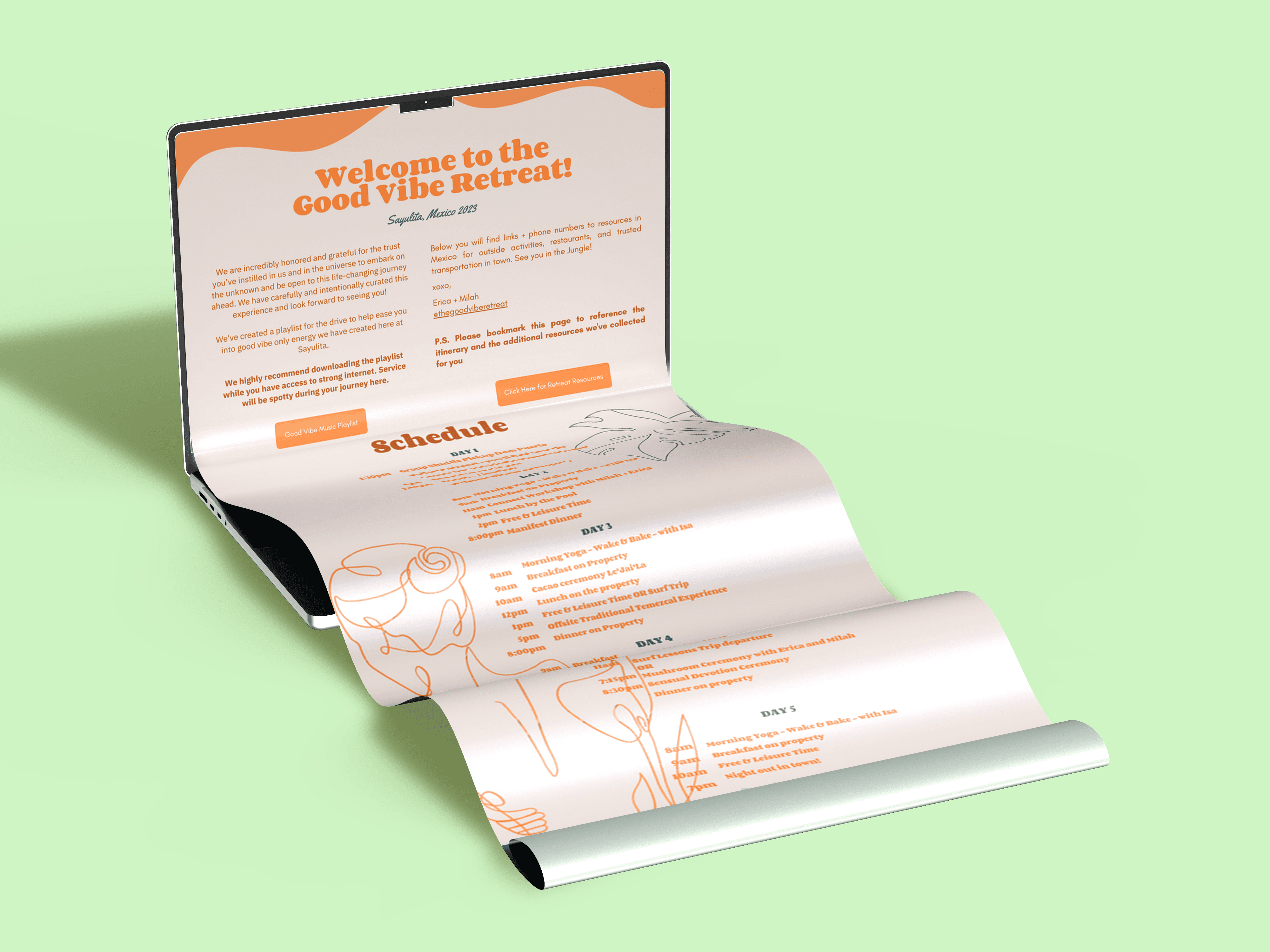 Audience orientation and emotional pacing were central to the experience. The landing page established tone through clarity and invitation, while a fully designed welcome document and illustrated itinerary guided participants through the retreat structure. These materials functioned as tools of reassurance, reducing friction and allowing participants to arrive feeling prepared and supported. To extend the experience beyond the event, I designed a 30-card printed affirmation deck as both a ritual object and a personal keepsake. The language balances grounding with humor and boundary-setting, reflecting the tone of the community and resisting the neutrality often associated with wellness branding. The visual system supports this balance through tactile and graphic choices that convey both warmth and authority. The final outcome operates as an integrated brand ecosystem. Across digital platforms, social content, and physical materials, the identity maintains coherence while allowing for variation and individual interpretation. The system supported both engagement leading up to the retreat and the on-site experience itself, establishing a consistent and culturally specific presence. At its core, the project positions wellness as an act of agency and collective care. Through design, the retreat frames rest as intentional, affirmation as self-defined, and community as an active structure of support.