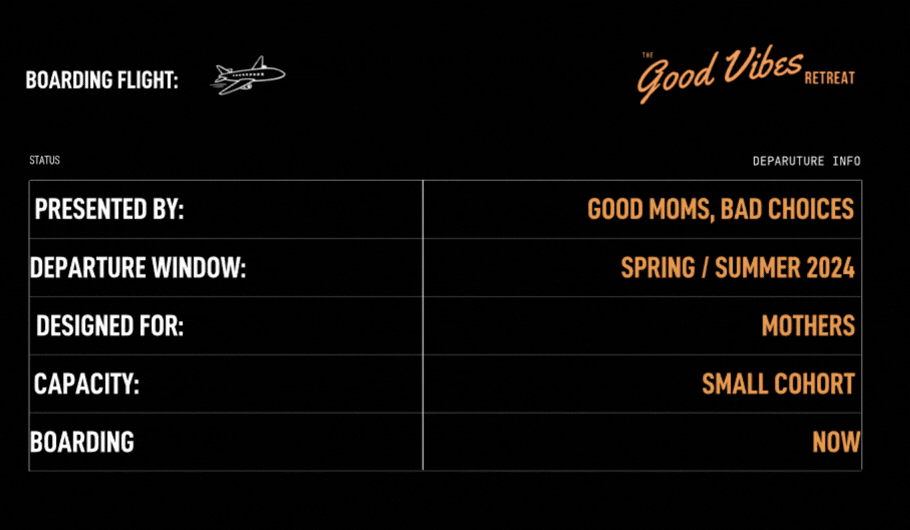 Good Vibes Retreat was developed as an extension of Good Moms Bad Choices, conceived as a temporary environment for mothers navigating the demands of care, labor, and constant negotiation. Rather than positioning wellness as an escape, the project approached it as a structured pause, offering space for rest, connection, and affirmation within a community defined by shared experience. The core challenge was to build an identity that acknowledged the realities of caregiving while supporting pleasure and personal agency in a way that felt culturally grounded rather than generic. The design direction was shaped by a central question: how can a wellness environment communicate softness and emotional grounding without losing a sense of strength, humor, and self-possession? For many mothers, rest is conditional, shaped by expectation and judgment. The identity reframes rest as self-directed and intentional, aligning with the voice of Good Moms Bad Choices and the lived experiences of its audience. I led the full creative direction and visual identity, developing a flexible system designed to function across digital, print, and on-site applications. Rather than relying on a single mark, the identity operates as a system of elements, including a bright, refined color palette, typographic pairings, accent graphics, and custom symbols. These components create a visual language that can shift in tone while remaining cohesive, supporting both intimacy and clarity. A key layer of the visual approach drew from the language of travel and departure. References to boarding passes, itineraries, and airport signage informed both layout and motion, positioning the retreat as a form of intentional movement rather than escape. Motion design emphasized transition, rhythm, and directional flow, reinforcing the idea of entering a different pace and state of mind. This framework extended across digital and physical touchpoints, creating a sense of anticipation, progression, and arrival.