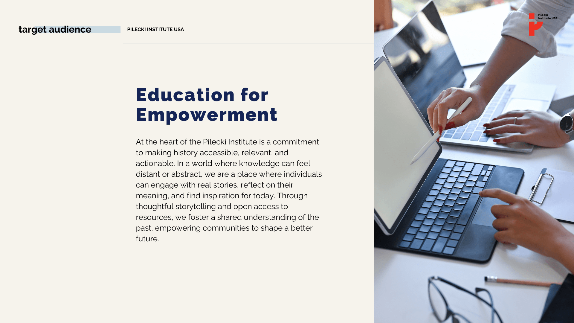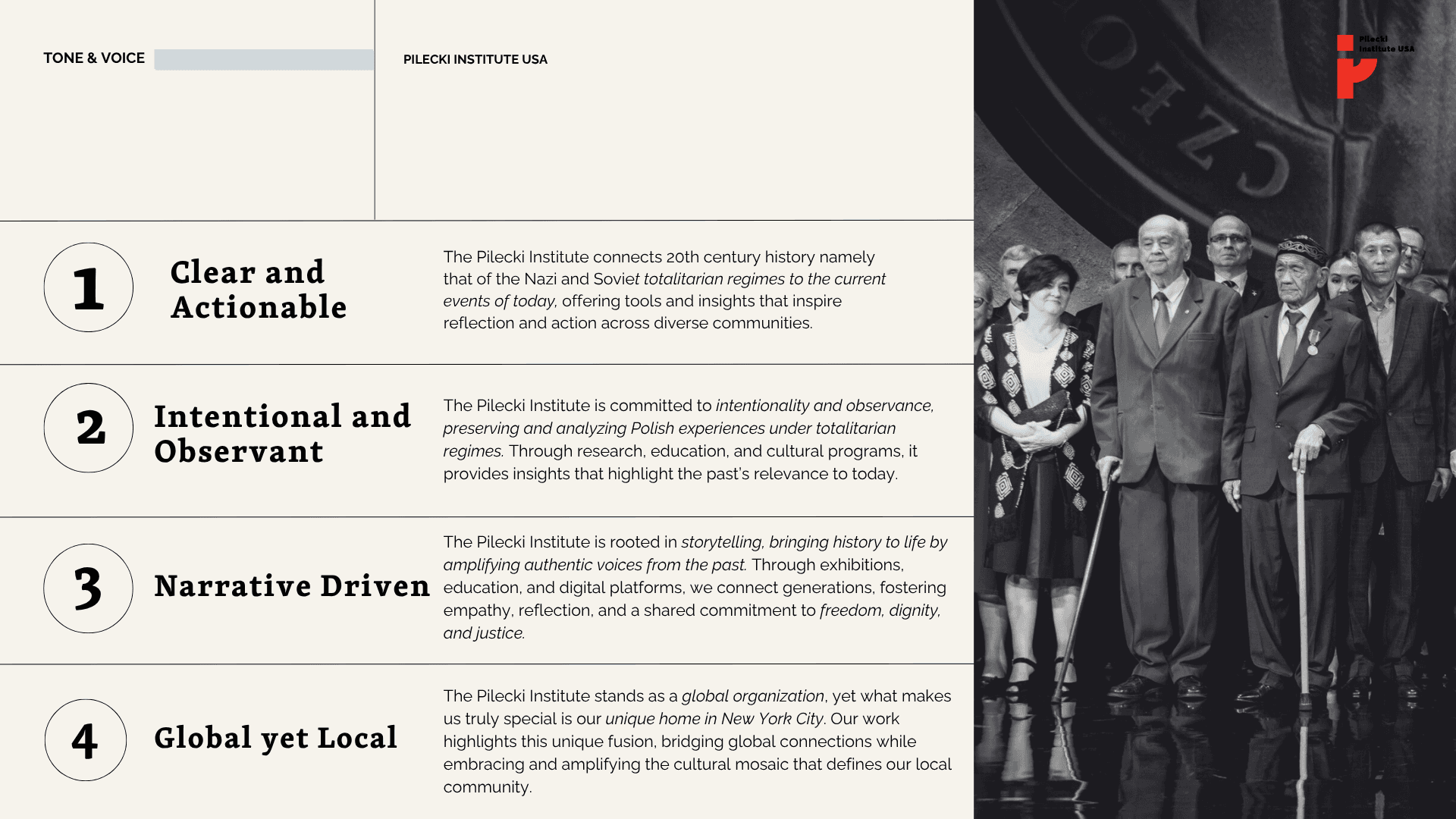 The system holds two priorities. Maintain alignment with the global Pilecki Institute network. Establish the New York location as a distinct extension and the first U.S. branch.